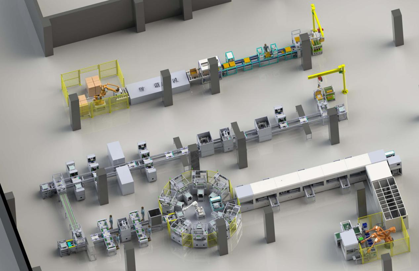 该产线是将方形电芯组装成模组,再将模组组装成动力电池包的自动化生产线,其工艺流程包括:电芯上料、OCV/IR、电芯处理、模组堆叠、侧板焊接、汇流排焊接、焊接检查、模组测试(EOL)等。